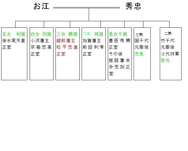 五女・和子(かずこ、まさこ、東福門院)は1620年、後水尾天皇の正室となり次女・興子(おきこ)を産んだ。