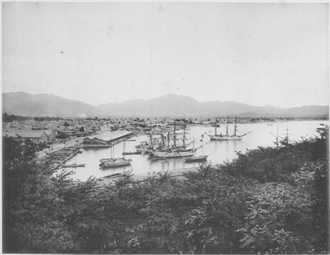 | 敦賀のシンボル 赤レンガ倉庫。石油や昆布を貯蔵した。近くに鉄路が通っていた。 | 見るたびに富士かとぞ思う野坂山 いつも絶やさぬ峰の白雪(平重盛) 1909年の敦賀港 福井市立歴史博物館蔵 |